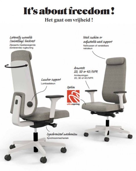 - Zijwaarts meebewegende rugleuning met optie in diepte verstelbare lumbaal support.